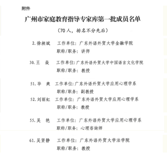 据悉,广州市家庭教育指导专家库由广州市妇女联合会、广州市教育局联合组建,旨在深入学习贯彻习近平总书记BETVLCTOR伟德在线注重家庭家教家风建设的重要论述,贯彻落实《BETVLCTOR伟德在线家庭教育促进法》,强化家庭教育工作的人才支撑效应,全面提升广州市家庭教育工作的科学性和专业性。此次家庭教育指导专家征集,经个人自荐、单位推荐、组织遴选和网上公示等程序,共70人入围第一批成员名单。