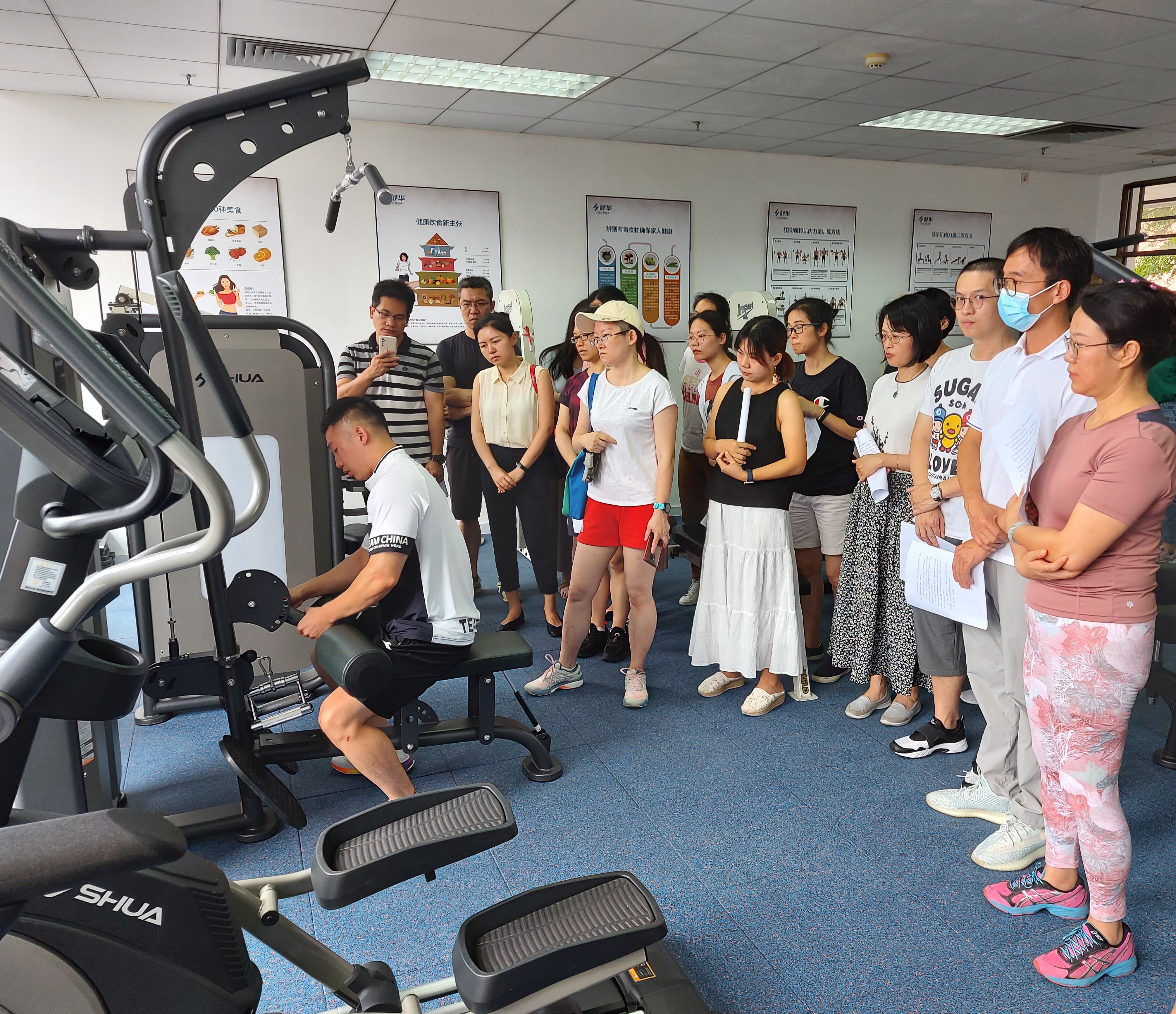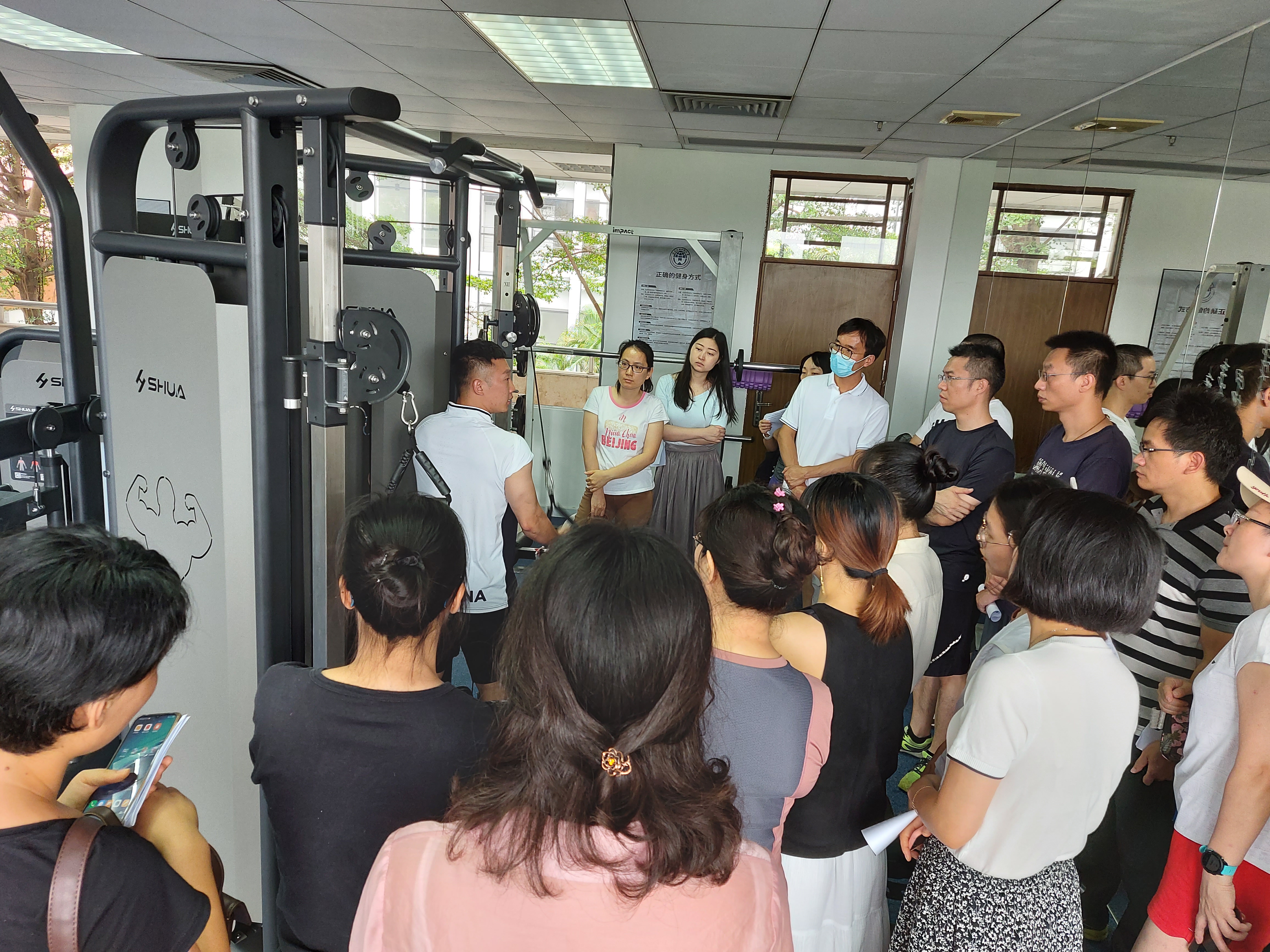 随后,黎老师对健身器材的使用方式、注意事项、日常保养维护等进行逐一介绍,并为正确安全地使用健身器材进行现场示范和指导。教职工们积极提出问题,互相交流。现场气氛活跃。
